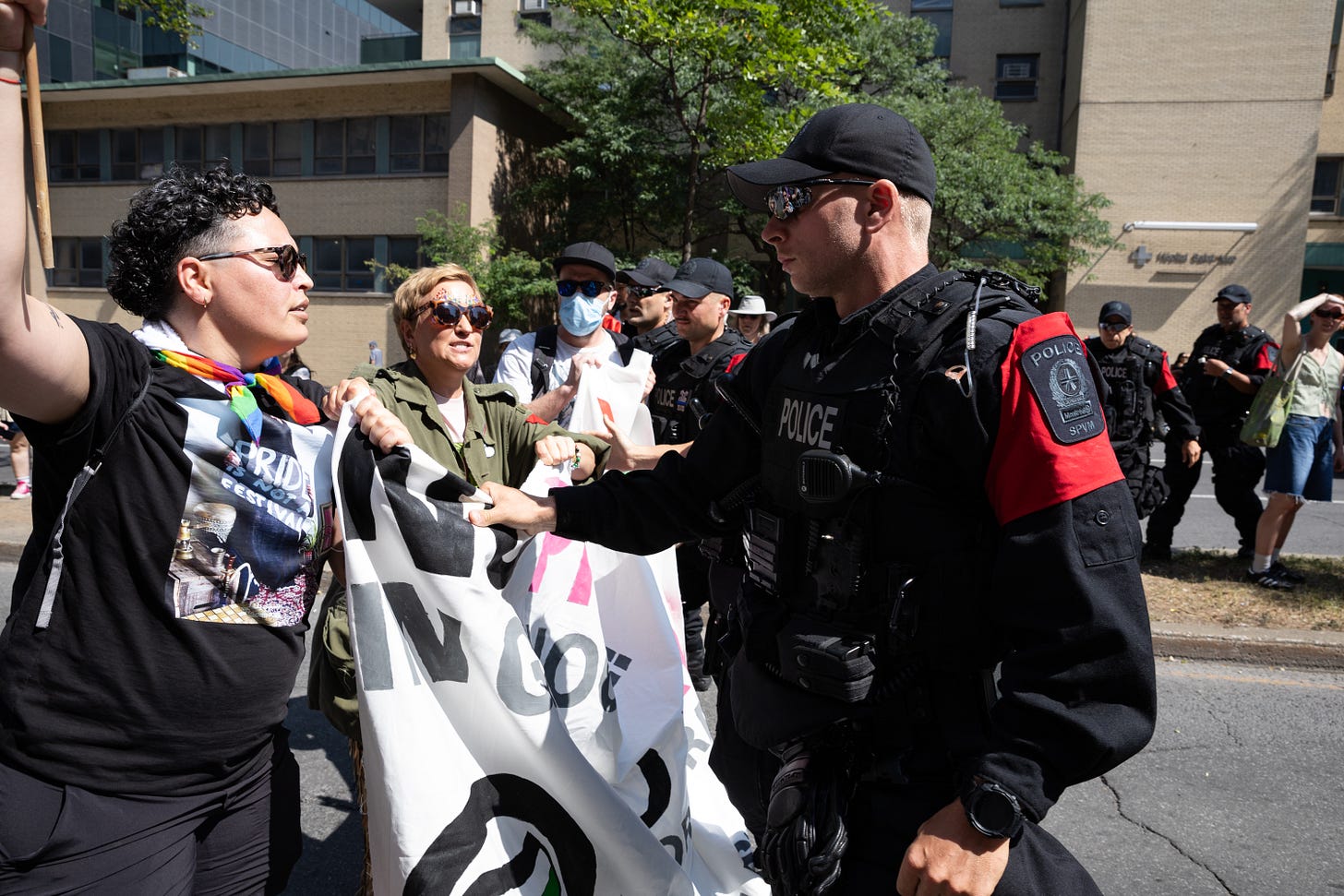 According to Rebecca Lavoie, one of the counter-protestors, no one was seriously injured, but one person was violently tackled to the ground and arrested. She says this violence reminded of the police response to last year's counter demonstration at Fierté.