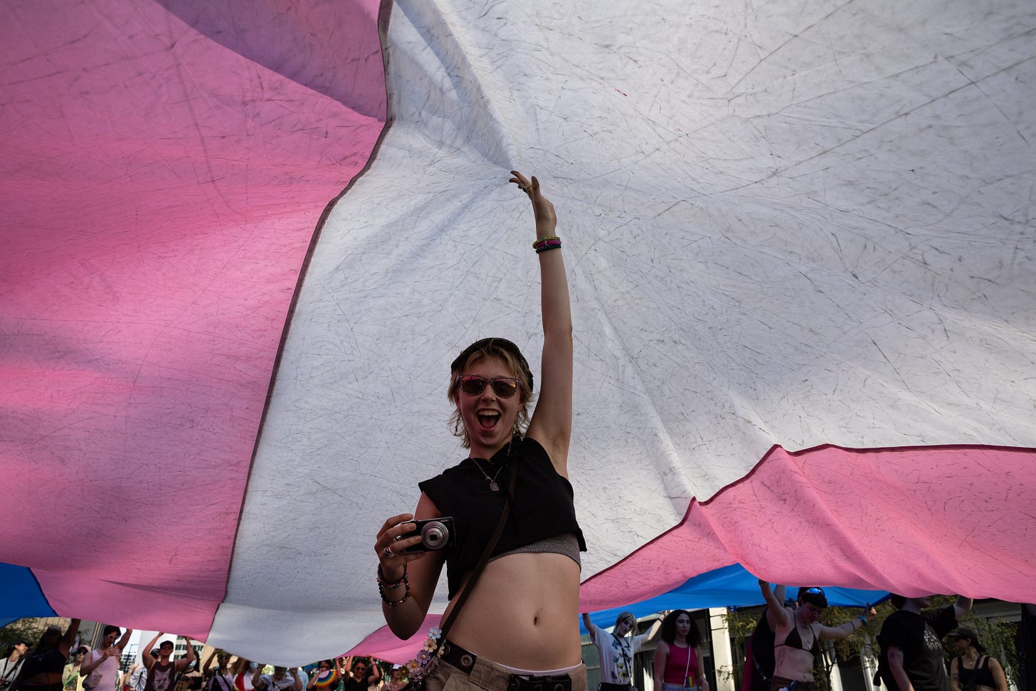 Wild Pride's march took off around 10,000 strong. People wore matching shirts representing community groups, not corporations. Instead of Rupaul and Lady Gaga tracks, the truck leading the parade blasted Palestinian music. Trans people, sapphic groups, BIPOC queer organizations and proud lesbians took up space in the march instead of being crowded out by cis gay men. While drummers kept the rhythm, marchers carried a parachute-sized trans flag at the parade's head.